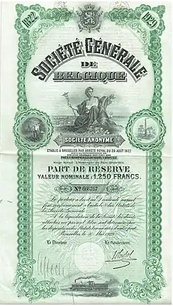2. ^ a b c d e Xavier Mabille (1993). "La Société Générale de Belgique : Eléments pour une histoire de la Banque mixte 1822-1934". Courrier Hebdomadaire du CRISP (29–30). Retrieved 9 October 2021.