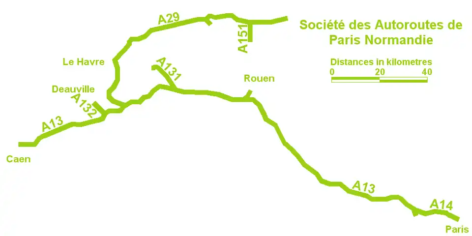 The SAPN was created in 1963 and since then, has fulfilled the targets set by the French government: build, maintain and operate a network of motorways. Its network serves two regions; Ile-de-France and Normandy. SAPN's network consists of the A14 (16 km long), the A13 (233 km long) and the A29 (119 km long). All motorways, except portions of the A13 are tolled.