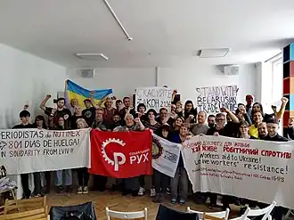 The Social Movement (Ukrainian: Соціальний рух, romanized: Sotsialnyi rukh;[a] abbreviated SR) is a Ukrainian left-wing community organization founded in 2015, which stands on the principles of democratic socialism, opposing capitalism and xenophobia. It operates in the largest cities of Ukraine (Kyiv, Kryvyi Rih, Lviv, Odesa, Dnipro, Kharkiv).[1] The group is aspiring to become a grassroots political party and came to some prominence during the 2022 Russian invasion of Ukraine when it called upon the international left to support the Ukrainian resistance to Russian imperialism and campaigned against wartime curtailing of certain labour rights by the Ukrainian government.[2]