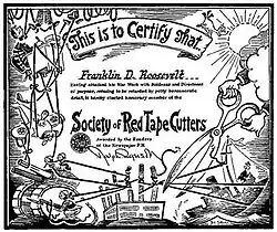 The Society of Red Tape Cutters was a series of small articles published by newspapers during World War II to give recognition to military and political figures for keeping bureaucracy from hindering the war effort. Each announcement included a boilerplate "certificate" illustrated by Dr. Seuss and a synopsis of the inductee's actions.