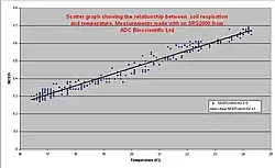 When using linear regression, multiple data points are graphed and the points can be fitted with a linear regression equation, which will provide a slope. This slope can provide the rate of soil respiration with the equation , where F is the rate of soil respiration, b is the slope, V is the volume of the chamber and A is the surface area of the soil covered by the chamber.[17] It is important that the measurement is not allowed to run over a longer period of time as the increase in CO2 concentration in the chamber will also increase the concentration of CO2 in the porous top layer of the soil profile. This increase in concentration will cause an underestimation of soil respiration rate due to the additional CO2 being stored within the soil.[18]