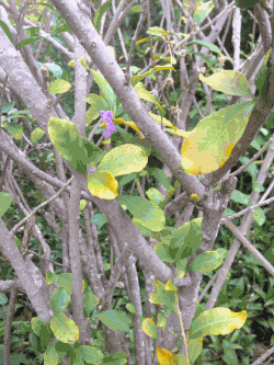 Solanum conocarpum can reach up to nine feet high and is found in dry, deciduous forests. This shrub grows up to about 3 meters with a grey-colored bark, elliptical shaped leaves about 2 cm long and with an orange midrib, and lavender-colored flowers. Individuals are dioecious, each only having flowers of one sex. Flowering is typically induced by rain events.
