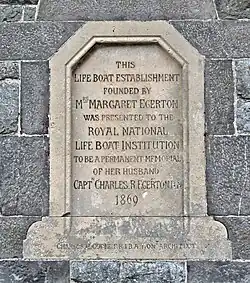 A site for the boathouse at Trinity Quay in Upper Solva, was provided by the Elder Brethren of Trinity House, who provided some building materials from the old smith's forge near the site, and granted a lease at a nominal annual rent. The boathouse was one of more than 200 designed by Honorary RNLI Architect Charles Henry Cooke FRIBA. A memorial plaque for Capt. Egerton was set into the side of the building.[8][9]