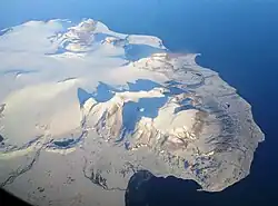 Aerial photo of Sørkapp Land, showing the bay of Sommerfeldtbukta in the lower mid part of the photo, with the nearby mountain of Kistefjellet.