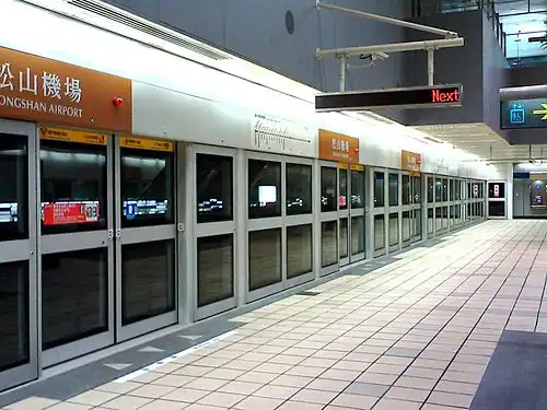 The Taipei Metro Songshan Airport station is located in Songshan, Taipei, Taiwan. It is a station on Wenhu line serving Taipei Songshan Airport.