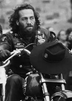 Ralph Hubert "Sonny" Barger Jr. (October 8, 1938 – June 29, 2022) was an American outlaw biker who was a founding member of the Oakland, California charter of the Hells Angels Motorcycle Club in 1957.[3] After forming the Oakland charter, Barger was instrumental in unifying various disparate Hells Angels charters and had the club incorporated in 1966.[4] He emerged as the Hells Angels' most prominent member during the counterculture era and was reputed by law enforcement and media to be the club's international president, an allegation he repeatedly denied.[5] The author Hunter S. Thompson called Barger "the Maximum Leader" of the Hells Angels,[6] and Philip Martin of the Phoenix New Times described him as "the archetypical Hells Angel", saying he "didn't found the motorcycle club ... but he constructed the myth".[7] Barger authored five books, and appeared on television and in film.