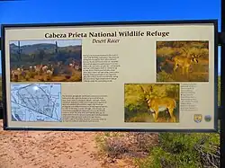 Adjacent to the BMGR is the Cabeza Prieta National Wildlife Refuge (CPNWR), also a critical breeding area for this species. Parts of the CPNWR are off limits to visitors between mid-March and mid-July, during the fawning season, so as to minimize disturbance to herds with fawns, which can result in the loss of fawns.[8] Despite this fact, this area too is subject to constant environmental pressure. The accompaniments of illegal trafficking of people and drugs from Mexico (such as the construction of illegal roads and trails, reckless disposal of trash, destruction of vegetation, and contamination of water sources) have significantly degraded the habitat. The response from law enforcement agencies (such as the U.S. Customs and Border Protection and the Drug Enforcement Administration) has also exacerbated this problem.[9][10]