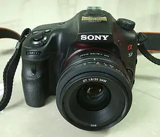 The Sony Alpha 57 (model name SLT-A57) is a Digital single-lens reflex camera that replaced the A55 in 2012. The camera features an electronic viewfinder and a translucent mirror. The main advantage of a translucent mirror is that it needn't flip up out of the way when taking a picture in order to expose the sensor, but the camera can focus and capture images simultaneously. The camera's 15-point autofocus system can be set to single, continuous or automatic and is arranged towards the centre. The 12-fps burst mode is available only in "speed priority" mode but can reach up to 5.5 fps burst rate in combination with any other settings.