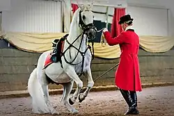 Members of the South African Lipizzaners working with a stallion performing the Pesade