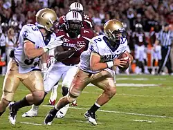 The Gamecocks' season had a rough start, with the team initially down seventeen points against East Carolina at a neutral site.[219] Garcia subsequently replaced Shaw at quarterback, shifting the game's momentum and sparking a comeback, which turned into a blowout victory.[219][223] Afterwards, Shaw conceded that it was Garcia's team.[219] Next, South Carolina started conference play, defeating Georgia by three points in a high-scoring "thriller" on the road.[224] The Gamecocks returned home to face Navy, and won after trailing in the fourth quarter.[225][226] Lattimore rushed for 246 yards, the fourth best rushing performance in school history until then, and three touchdowns.[225] South Carolina then dominated Vanderbilt defensively, winning at home by eighteen points.[227] Staying at home, the Gamecocks welcomed defending national champion Auburn,[228] now without Cam Newton.[229] Despite another "stellar" defensive performance, South Carolina lost by three points, their third loss to the Tigers in two seasons.[230][231] The Gamecocks fell to 4–1 and No. 18 in the country.[228] With Garcia having nine interceptions in five games, Shaw was reannounced as the starter.[154] Garcia would soon be dismissed from the team for failing to comply with guidelines,[232] and Shaw would subsequently be the starting quarterback for much of South Carolina's next 2.5 seasons (2011–13).[233]