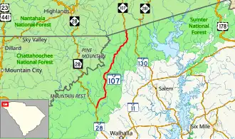 South Carolina Highway 107 (SC 107) is a 15.290-mile (24.607 km) state highway in the western part of the U.S. state of South Carolina. It connects Oconee County with Jackson County, North Carolina and the Cashiers area. Nearly the entirety of the route is located in the Sumter National Forest.