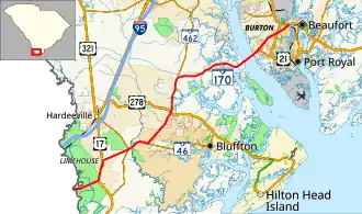 South Carolina Highway 170 (SC 170) is a 49.010-mile (78.874 km) state highway, connecting northern Beaufort County with southern portions of Beaufort and Jasper counties. Due to increased population growth in both areas, the majority of the road is four lanes wide, with certain areas retaining the original two-lane configuration.