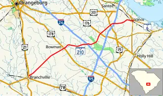 SC 210 begins at an intersection with U.S. Route 21 (US 21; Freedom Road) in Branchville, within Orangeburg County. It travels to the northeast and leaves the city limits. The highway immediately crosses Pen Branch. It continues to the northeast and crosses over Cattle Creek and Sandy Run before entering Bowman. There, it has a very brief concurrency with US 178 (Charleston Highway). The highway crosses over Cow Castle Creek before heading to the east. After an interchange with Interstate 26 (I-26), the highway curves back to the northeast. In Providence, SC 210 intersects US 176 (Old State Road). After crossing over Providence Swamp, the highway intersects US 15 (Bass Drive). It heads to the east again, crossing over I-95. It crosses over Horse Range Swamp and then enters Vance. In town, it crosses a railroad track and intersects SC 310 (Camden Road). In the eastern part of town, it meets its eastern terminus, an intersection with SC 6.[2]