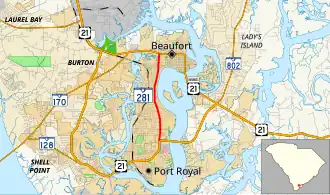 South Carolina Highway 281 (SC 281) is a 3.190-mile (5.134 km) state highway located entirely within Beaufort County, in the southern part of the U.S. state of South Carolina. Known locally as Ribaut Road (pronounced REE-bo), SC 281 serves as an arterial connecting Beaufort and Port Royal.