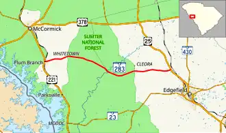 SC 283 begins at an intersection with U.S. Route 221 (US 221)/SC 28 (Main Street) in Plum Branch, within McCormick County, where the roadway continues as Collier Street. It travels to the east and nearly immediately curves to the east-northeast before leaving the city limits. The highway curves back to the east and crosses over Stevens Creek. SC 283 goes back to the northeast and enters Whitetown. Just past the intersection with Upper Mill Road the highway enters Sumter National Forest. After it starts heading to the east-southeast, it crosses over Byrd Creek. After a crossing of Wine Creek, it crosses over Turkey Creek and enters Edgefield County. Just to the east of an intersection with North Martintown Road, which is south-southwest of Cleora, the highway leaves the national forest. Farther to the east, it meets its eastern terminus, an intersection with US 25, at a point northwest of Edgefield.[3]