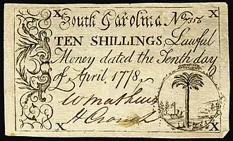 The pound was the currency of South Carolina until 1793. Initially, Pound sterling circulated, supplemented from 1703 by local paper money.[1] Although these notes were denominated in £sd, they were worth less than sterling, with 1 South Carolina shilling = 8d sterling. The first issues were known as Proclamation Money. They were replaced by the Lawful Money issue in 1748, with 1 Lawful shilling = 4+23 Proclamation shillings.