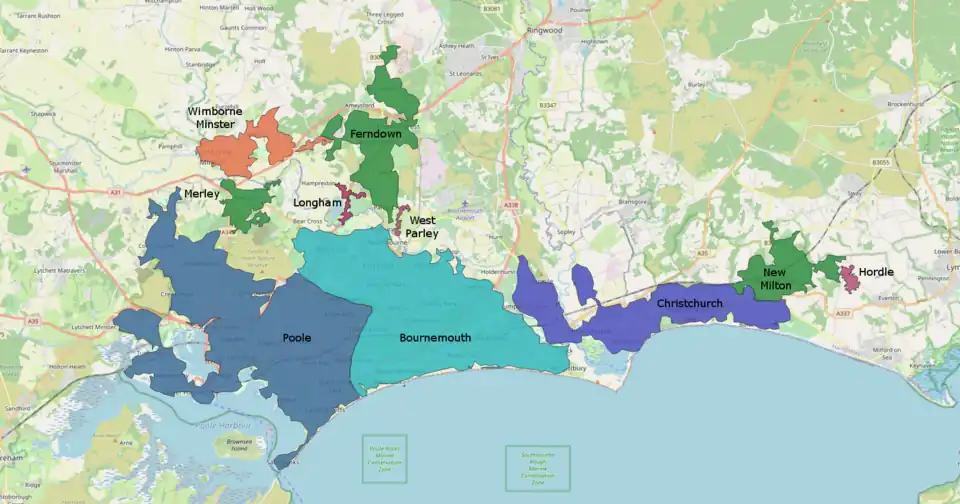 The main population centres are Bournemouth, Christchurch, and Poole which are served by the single unitary authority of Bournemouth, Christchurch and Poole. However, the urbanised area spreads into the area of the Dorset unitary authority and into the New Forest District as far east as Barton on Sea. There are a number of satellite towns peripheral to the urban centres, including (listed clockwise) Wareham, Verwood, and Ringwood (Hampshire). The urban area is generally surrounded by a green belt.