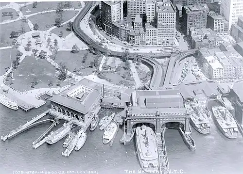 1. ^ "BATTERY ELEVATED TERMINAL BURNS; Hundreds of Passengers and Employes Barely Escape as Swift Flamas Sweep Station. EMPLOYES DROP TO STREET Women Crawl Along Roof with Fire Roaring Through Frame Shell Under Them. STARTS UNDER WOODEN CAR An Downtown Firemen and Fleet of Fireboats Kept Busy--Ferry House Damaged". The New York Times. July 3, 1919. ISSN 0362-4331. Retrieved September 20, 2017.