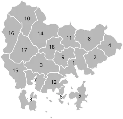 Gyeongsangnam-do is divided into 8 cities (si) and 10 counties (gun). The names below are given in English, hangul, and hanja.
