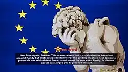 The scenes Ubisoft removed depict anal probing by aliens and the player-character performing an abortion. In their place, the game displays a still image of a statue holding its face in its hand, with an explicit description of events depicted in the scene.[89] In Australia, the same scenes were removed because the Australian Classification Board refused to rate the game for release due to the depiction of sexual violence—specifically the child player-character being subjected to anal probing and the interactive abortion scene. Like the European version, these scenes were replaced with a placeholder card with an explanation of what was removed on a background image of a koala crying.[91]