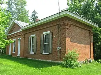 Architecturally, the South School is a distinctive example of the Greek Revival style of architecture.[2] Constructed on a limestone foundation, it is built of brick and covered with a metal roof.[3] Among its most distinctive elements is the decorative brickwork that appears at certain points on the exterior; such styling is common on buildings constructed during Yellow Springs' golden age in the mid-19th century, but is a stark difference from the county's other historic school buildings. Architectural historians have seen the brickwork as an indication that the school was constructed by local brickmaker and contractor J.W. Hamilton, who established his business in the community in 1848 and was an active part of the community for over thirty years.[2]