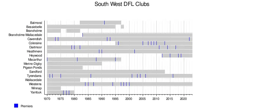 Demons Macarthur Recreation Reserve, Macarthur PFFL 1890s 1970–1997 4 1970, 1981, 1988, 1995 Merged with Hawkesdale in 1998 and moved to Mininera & District FL