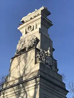 The memorial stands on the east side of Watts Park, alongside Above Bar Street. It consists of a cenotaph—a pylon surmounted by a sarcophagus bearing a recumbent effigy of a fallen soldier—raised on five stone steps, in front of which is a Stone of Remembrance raised on two further steps. The cenotaph is a tapering, five-tiered pillar, connected by a low wall to two flanking columns topped by sculpted pine cones, which symbolise eternal life (being the fruit of an evergreen tree, the tree of life). The thin sheets of white Portland stone on the outside of the monument hide an inner brick core.[14][15][16][17][18]