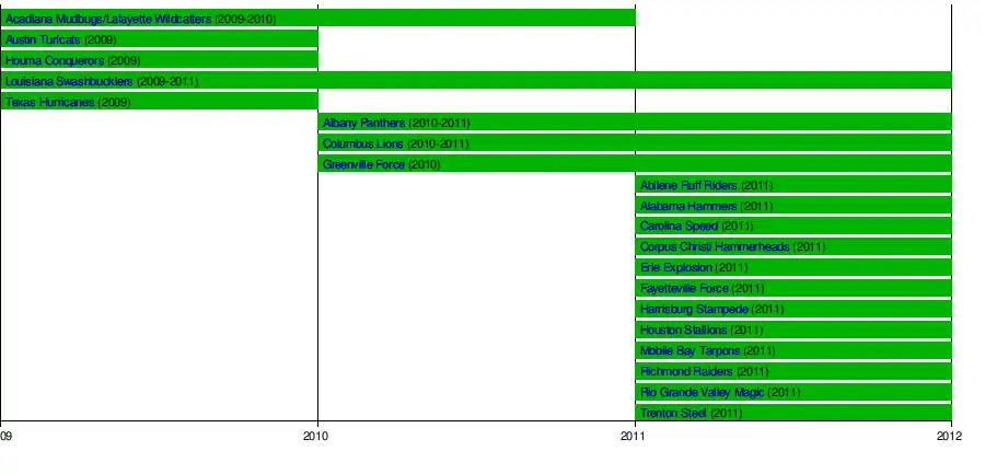 - Fayetteville Force – original team left league midway through the 2011 season. Temporary team backed by the American Indoor Football Association played out the remainder of the season in the Force's place under the Force name.