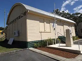 With increasing popularity of the area, and organisation of the military strategy a drill hall was constructed at Southport in 1890 on a military reserve in Lawson Street. This was a simple rectangular planned timber building housing a large open hall and abutting this a row of small rooms one an office and the other armouries for the three companies who trained in the building. The Drill Shed was completed in about November 1890 for a cost of £335/2/- by Coomera builder, John Fortune. The building was designed and construction administered by the Queensland Colonial Architect's Office of the Department of Works. Apparently George Connolly was the architect for the project. It is unclear whether the design was in fact a standard plan used for other drill halls although others constructed at this time, including that planned for Warwick (1888) were very similar. The design of the new Southport Drill Shed was in line with the maxim that military architecture was, above all else, functional, designed to maximise the safety and efficiency of personnel and their work. The timber used for the building was cypress pine and the curved, corrugated iron clad roof, was supported on wrought iron trusses. The windows were shaded with central pivoted timber shutters and a series of galvanised iron fixed louvre panels ensured cross ventilation. When finished the timberwork was painted white and included a detached toilet and fencing. Repairs and restoration were carried out in 1899, prior to the building reverting to Australian Government ownership following Federation of Australia.[1]