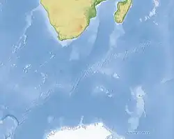 The Southwest Indian Ridge (SWIR) is a mid-ocean ridge located along the floors of the south-west Indian Ocean and south-east Atlantic Ocean. A divergent tectonic plate boundary separating the Somali plate to the north from the Antarctic plate to the south, the SWIR is characterised by ultra-slow spreading rates (only exceeding those of the Gakkel Ridge in the Arctic) combined with a fast lengthening of its axis between the two flanking triple junctions, Rodrigues (20°30′S 70°00′E / 20.500°S 70.000°E / -20.500; 70.000) in the Indian Ocean and Bouvet (54°17′S 1°5′W / 54.283°S 1.083°W / -54.283; -1.083) in the Atlantic Ocean.[2]