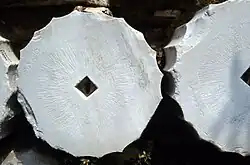 The columns come from an unfinished double stoa, built at Thorikos in southeastern Attica in the late fifth century BC.[7][8] The fluting was added when the columns were brought to the Agora.[9] The anta capital imitates the column capitals from Thorikos, but was newly made in the Roman period, specifically for this structure.[10] The wall blocks come from a wall that ran down the centre of this double stoa at Thorikos.[10][11] The fragments of the epistyle and frieze derive from a second century BC structure, which was probably destroyed during the Sullan Sack of Athens in 86 BC.[12] The triglyphs were taken from four or more different temples, ranging in date from the Classical period to the late Hellenistic period. They were originally of different sizes, but were recut to fit the southwest temple.[13] Other fragments were newly made in the Roman period[14]