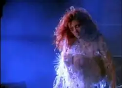 Mylène Farmer in the much debated videoclip "Souviens-toi du jour". Her transparent dress and her suggestive positions was considered as a lack of respect toward the Holocaust.