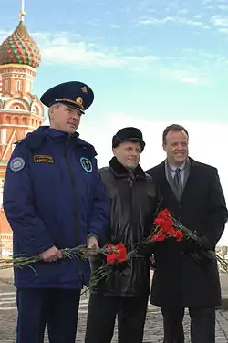 ![]() From left to right: Garan, Samokutyayev and Borisenko in front their Soyuz TMA-21 spacecraft dubbed "Gagarin" Soyuz programme (Crewed missions) | |