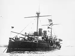 Reina Regente was one of the Spanish Navy ships present at Barcelona, Spain, for the opening of the 1888 Barcelona Universal Exposition on 20 May 1888. In a ceremony at Barcelona on 3 June 1888 with Queen Regent Maria Christina in attendance, she received a battle ensign the queen regent gave to her.[1] Reina Regente was part of the Training Squadron, which also included the unprotected cruiser Reina Cristina and the protected cruiser Isla de Luzón, when Maria Christina visited the squadron on 11 August 1890.[1] On 4 September 1892, the Training Squadron — by then under the command of Contraalmirante (Counter Admiral) Zoilo Sánchez de Ocaña y Vieitiz and made up of Reina Regente, the battleship Pelayo, the unprotected cruiser Alfonso XII, and the armoured frigate Vitoria — rendezvoused with the torpedo gunboat Temerario at Genoa, Italy, where the ships represented Spain at events celebrating the 400th anniversary of Christopher Columbus's discovery of the Americas.[1] On 12 October 1892, Reina Regente was at Huelva, Spain, for more ceremonies honoring the discovery.[1]