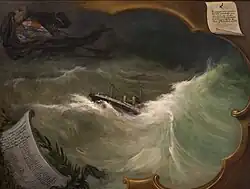 Reina Regente sinks with the loss of all hands during a storm on 10 March 1895 in an oil painting by Manuel Ussel de Guimbarda (1833–1907). Many of her crew lived in Cartagena, Spain, and the coat of arms of Cartagena covered by a mourning veil is in the upper left corner to signify the pain the city experienced in the disaster.