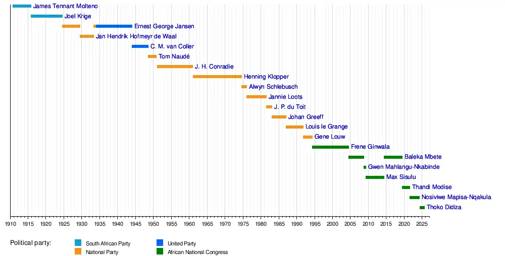 The office of speaker of the National Assembly was preceded by the offices of speaker of the House of Assembly (1910–1984) under the 1909 and 1961 constitutions and speaker of Parliament under the Tricameral Parliament (1984–1994).