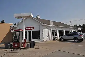 It is a one-story building with five bays: an angled office bay, a shop bay, and three car service bays. It was built by Alfred J. Sheep, a rancher and businessman, as the first gas station in the community, with the service bays added in 1927. Sheep operated the station until his death in 1957.[2]