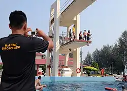 Graduates of the Search and Rescue Diver Course are sent to the MCG Diving School, situated in the Sultan Ahmad Shah Coast Guard Academy in Kuantan, Pahang. At this facility, they showcase their acquired skills and demonstrate rescue diver capabilities, including activities such as jumping from high platforms and executing sea rescues of downed pilots.[26]