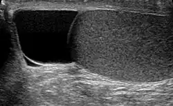 Ultrasound of a testicle (grey) and a spermatocele (black).