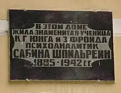In 2002 a commemorative plaque made by the Rostov-on-Don sculptor B. N. Kondakov was installed on the building's façade. It reads: "The famous student of K. G. Jung and S. Freud, psychoanalyst Sabina Spielrein (1885-1942), lived in this house»[7]