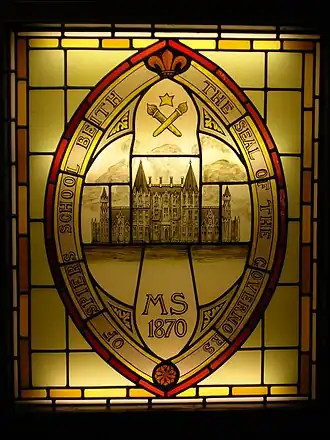 Spier's school or college when first completed had a 100-foot (30 m) belltower, hall, boardrooms, 10 classrooms and school-house all designed in the 17th-century style by Campbell Douglas and James Sellars, a Glasgow architectural firm.[32] James Sellars died before the school was completed. The old seal of the governors and a stained glass window (now in Beith Primary School) depicting the seal, shows that a "French middle point" design had originally been intended. The buildings actually constructed were also on a smaller scale than had been intended.[1] The cost was £12,000.[21] An Art room, gymnasium and a Science room were added in 1908, during Dr Third's time.[21] Four Horsa classrooms were added after 1945, being built on the site of the Head Master's garden or orchard. Electricity was installed once the Ayrshire Education authority took charge, however after closure on 30 June 1972 the buildings were subject to vandalism and all the buildings were demolished in 1984.