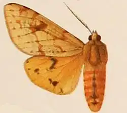 Pectus sooty black with orange-red margins; legs sooty black brown; palpi and sides of frons black, rest of head and thorax pale bronzy gall-stone yellow; antennae brown; abdomen salmon colour with dorsal central dark fuscous line. Forewing pale bronzy buff with four irregular transverse bands of apricot orange, the ante- and postmedian ones joined by a longitudinal band of same colour along the median nervure, a big patch of apricot orange at apex of cell. Hindwing bronzy buff washed with pale crimson, a median and postmedian band of large black blotches, and from apex to vein 4 a submarginal row of five black spots.