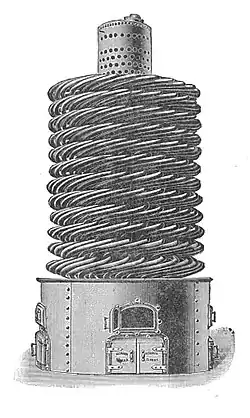 The Lune Valley boiler was a small oil-fired boiler, used by the Lune Valley Engineering Co. of Lancaster, England for steam launches and small steamboats.[7][8] Each steam generator tube consisted of three turns, giving a greater heating surface for the number of pipe joints to be made. These coils were still arranged in tiers.
