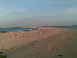 Most spits have a triangular base and numerous lagoons on their west side. The ends of some spits are widened and bent westwards. Their shape rapidly varies with time. For example, the Arabat Spit (the largest and most stable spit on the Azov Sea) was formed only around 1100–1200 AD,[4] and some spits were partly or entirely washed away by water currents.[5] Many spits are used as resting ground by migrating birds (mostly ducks, geese, swans, sandpipers, great cormorants and seagulls, see e.g. this and this pictures) and therefore some are declared national nature reserves. Examples are the Beglitsk,[6] Bilosaraysk,[7] Kriv[7] and Berdiansk spits. In addition to bird colonies, the Bilosaraysk and Berdiansk spits also host more than 200 vegetation species each.[8][9][10] The Berdiansk Spit is remarkable for having one of the oldest lighthouses on the Azov Sea (160 years old).[11] The Petrushino Spit is historical in that in 1697, Peter I built a major fortress at its base.[12] In July 1711, a Turkish landing operation was defeated there.[13]