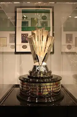 The trophy is 24 inches (61 cm) tall and weighs 27 pounds (12 kg).[1] It was designed in 2003 by Bruce Newman[2] and was first awarded in 2004 to series champion Kurt Busch and the last one being awarded to Jimmie Johnson in 2016.
