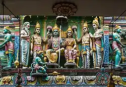 In 1904, management of the temple passed to Somapah's niece, Joognee Ammal. In 1933, Ammal had the main shrine built and consecrated, using donations from the prominent brothers Naraina Pillai and Pakirisamy Pillai. Ammal passed on responsibility for the temple to Pakirisamy in 1934, and he remained in this role until his passing in 1984. After that, this role passed to his son, Sivaraman, who remains Chairman of the temple today.[3] After taking over, Sivaraman sponsored an extensive renovation between 1985 and 1989, and the temple was reconsecrated in a Mahakumbhabhishekham ceremony in November 1989, attended by the Minister for Community Development and Foreign Affairs Wong Kan Seng.[10] On 6 June 2014, the temple's gopuram, mandapa and boundary walls were gazetted for conservation as a national monument of Singapore.[3] The temple was renovated again in 2002, and thereafter between 2016 and 2018, at a cost of S$4 million.[10] It was reconsecrated in 2018 at a 48-day long Mahakumbabishekham ceremony, attended by S. Iswaran, Edwin Tong and Denise Phua and an estimated 10,000 devotees.[11][12][13]