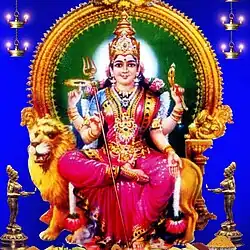 According to the Devanga Purana, the sage Devala is regarded to be the progenitor of the Devanga community.[2] An incarnation of Manu, he is believed to have emerged from the third eye of Shiva to create clothing, and to teach weaving to the world. When Devala returned after obtaining threads from Vishnu, a group of five rakshasas, Vajramushti, Dhoomravakra, Dhoomratchasa, Chithrasena, and Panchasena, attacked him at midnight. In the dark, the power of the rakshasas was overwhelming. Devala attempted to fight them off by using Vishnu's Sudarshana Chakra, but failed, and finally prayed for Shakti to protect him. Shakti appeared in light and glory, wearing a bright full crown, holding a trident and other weapons in her hand while mounted on a lion. She killed the rakshasas; their blood was white, black, red, green, and yellow. Devala soaked his threads in the rakshasas's colorful blood. Shakti was offered the name Sowdeshwari or Chowdeshwari, literally meaning, 'the goddess of brightness'. Sowdeshwari advised Devala to worship her during every new moon (Amavashya).[3][4]