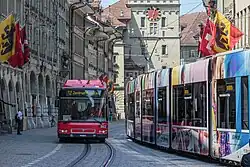 The Städtische Verkehrsbetriebe Bern (SVB) is a public transport operator in and around the Swiss capital city of Bern. It is also known by its marketing name of BERNMOBIL, and operates the city's network of trolleybuses, motor buses, and trams, including five existing tram lines and five historical tram lines.[1] It was formed in 1947 by the merger of the Städtische Strassenbahn Bern (SSB), which operated trams and trolleybuses, with the Stadt-Omnibus Bern (SOB), which ran motor buses.