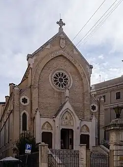It was built between 1855 and 1859, designed by the Scottish architect George Wigley. The facade made of brick and travertine features three doors. In the central tympanum of the door there is a polychrome mosaic, depicting Our Lady of Perpetual Help. The facade is further embellished by a rose window.