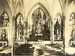 A census taken in 1904 counted 42 German families, mostly farmers, 56 Irish families, mostly railroad workers, and 8 French families. In 1904 a new, white-oak main altar with ornate reredos was constructed, along with an additional two side altars of white walnut dedicated to Saint Joseph and Saint Anthony (right). The side altars of the Sacred Heart and the Blessed Mother were original to the church and also made of white walnut. By 1907 the parish census counted 738 people. The Catholic influence in the Chillicothe area was evidenced by the Franciscan's Historical Sketches of the parish (1905), which contained over 100 advertisements of one-quarter page or more.[2]